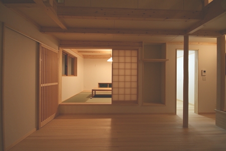 当初は改修も視野に入れていましたが、基礎に鉄筋が入っていない事が分かった事から建て替えをすることになりました。全面道路からの建物の見え方と中からの視線に配慮しました。小上がりになったダイニングは掘り炬燵となっており、直下に床下温水暖房が設置されています。また、ロフトを利用した夏の風の流れも意識し設計しました。
