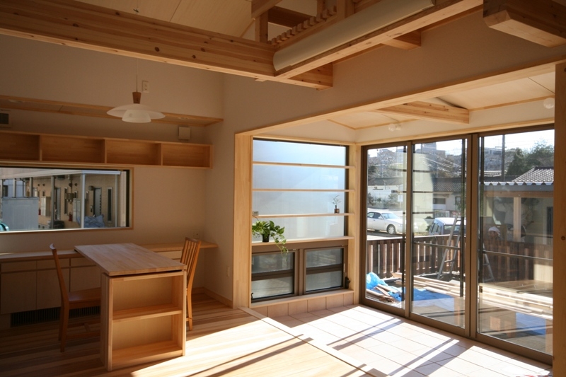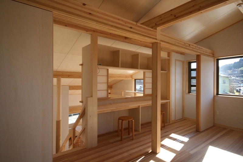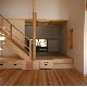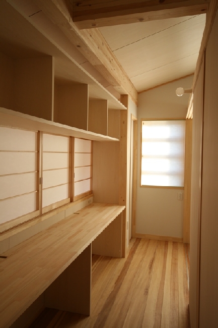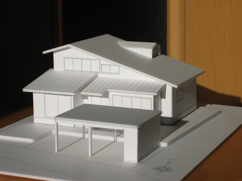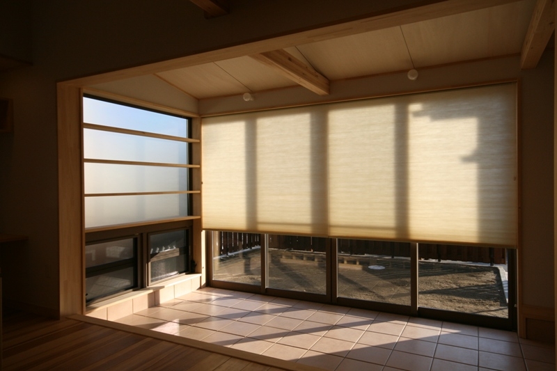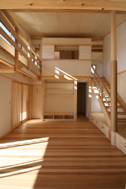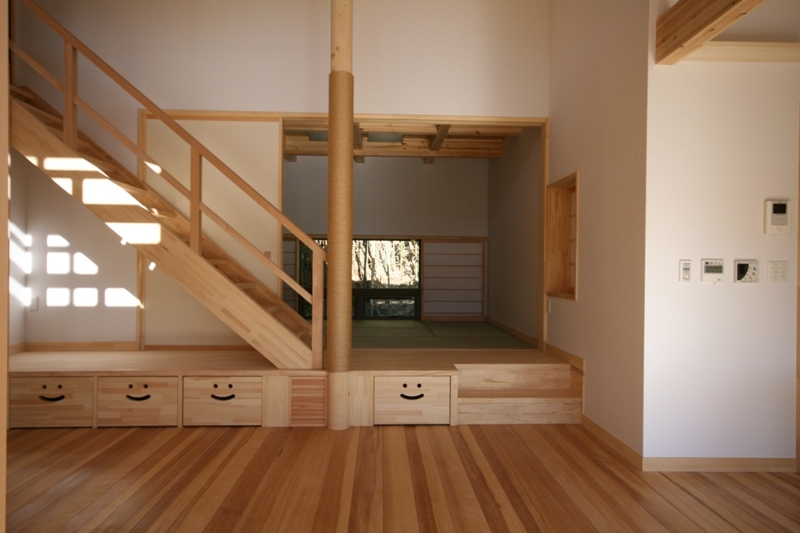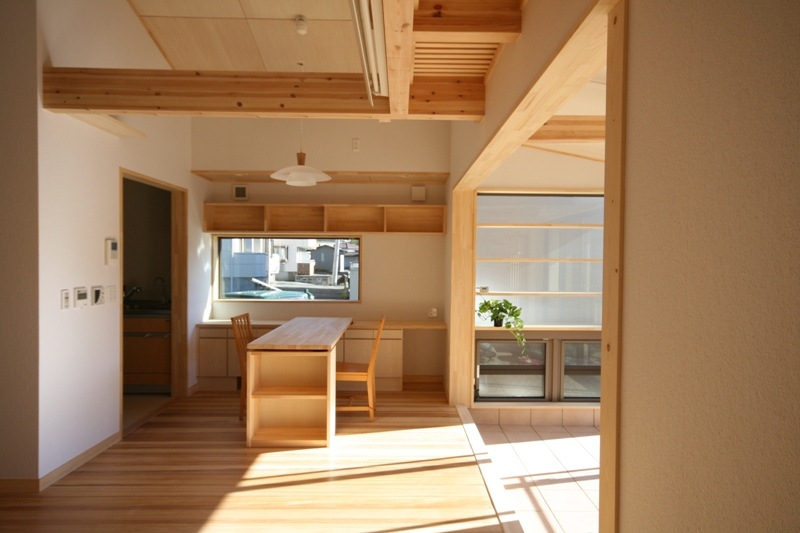隣地の純和風の建物に配慮したデザインとしました。周りの景観と合わせる事で綺麗な街並みが出来上がっていくと思います。吹き抜けを通してダイニングから子供部屋までつながる事で子供達の気配を感じる事ができる設計としました。また、北側奥に設けた和室は天井を押さえた設計とし、落ち着きのある部屋としました。