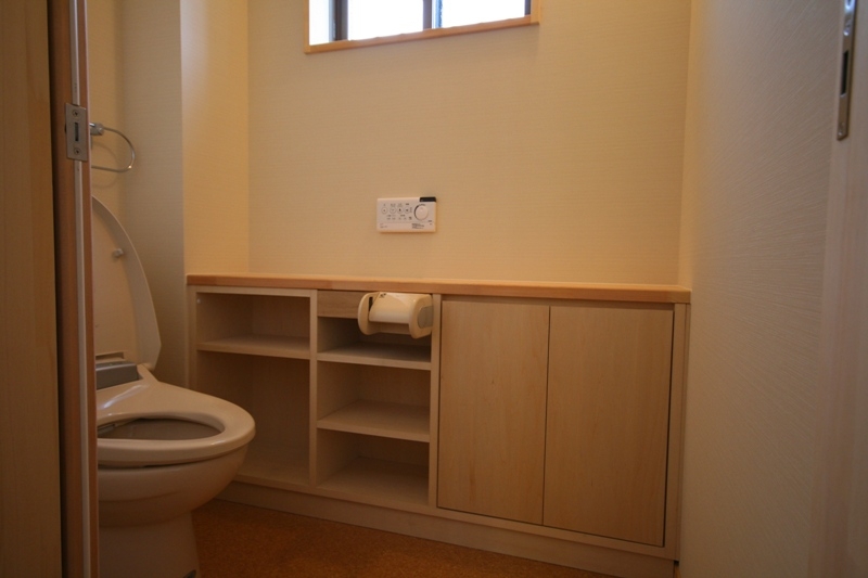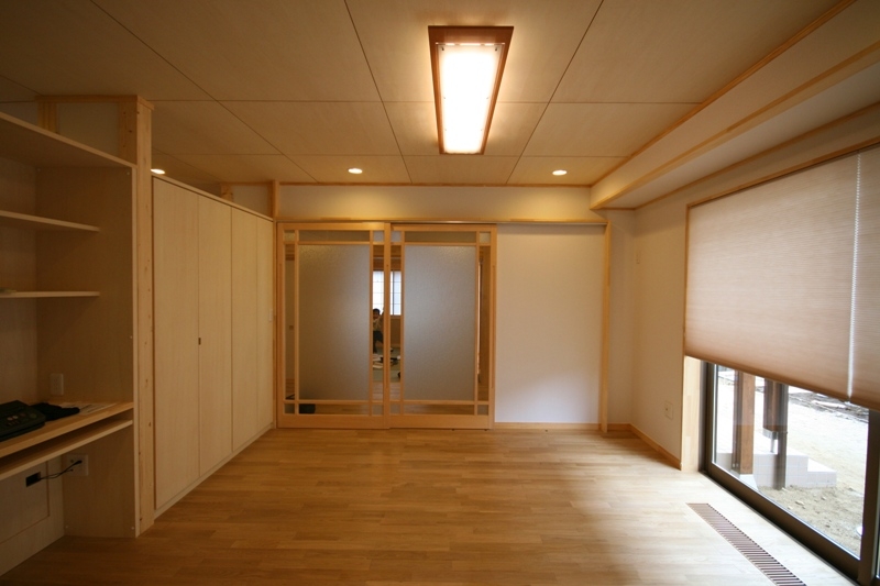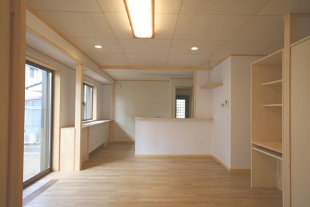 床下温水暖房による全館暖房の為、引戸を開放しても寒くないので、和室から玄関ホール、リビング・ダイニングまでを一空間にすることで広がりのある設計としました。また、北側道路からどうしても見えてしまう設備機器をいかに隠せるかを配慮しました。