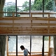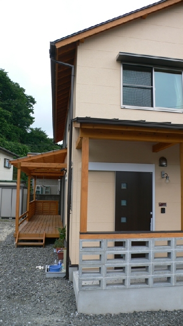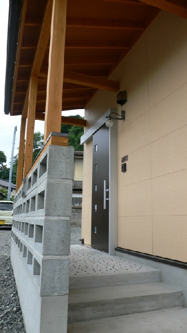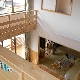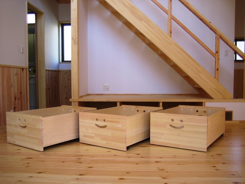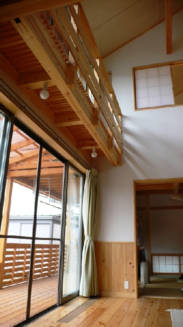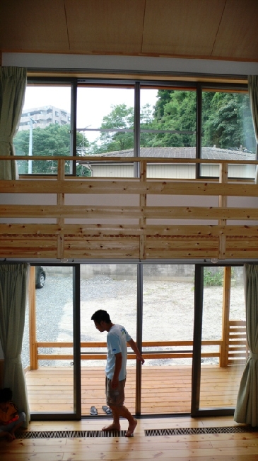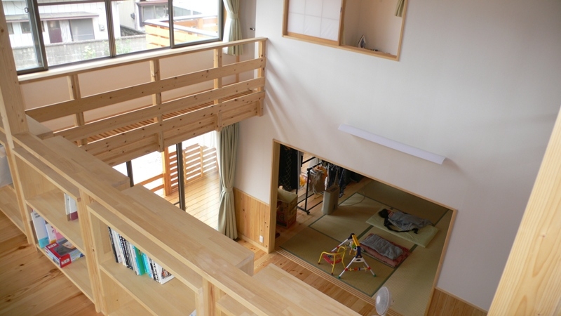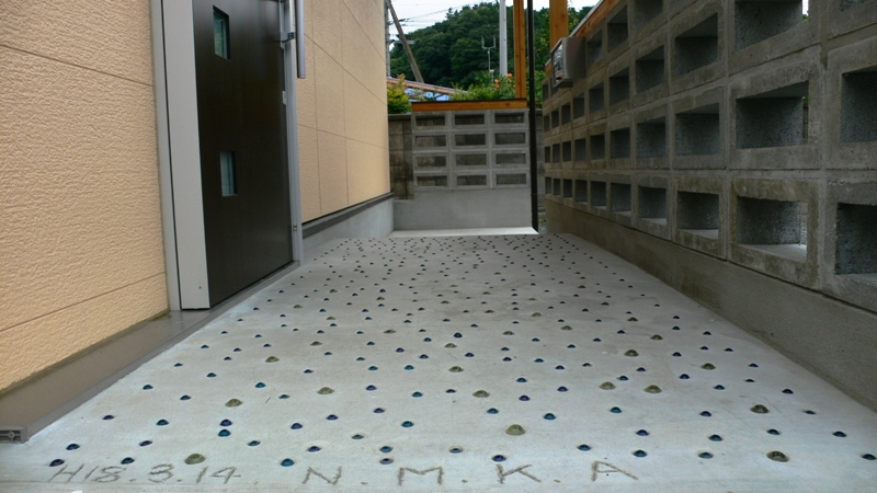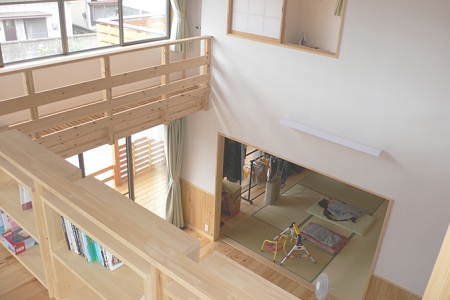 吹き抜けの周りをぐるぐる回れる楽しい家です。将来、子供の成長に合わせて仕切りを作ったりする計画とし、あえて未完成としました。また、間仕切りや建具を少なくする事と、玄関ポーチの床をタイル貼りとせずにコンクリートにビー玉を埋め込む事でローコスト化も図りました。蓄光ビー玉も交えているので、夜はほんわかと光を放ちます。