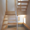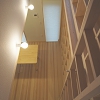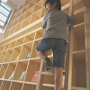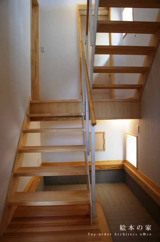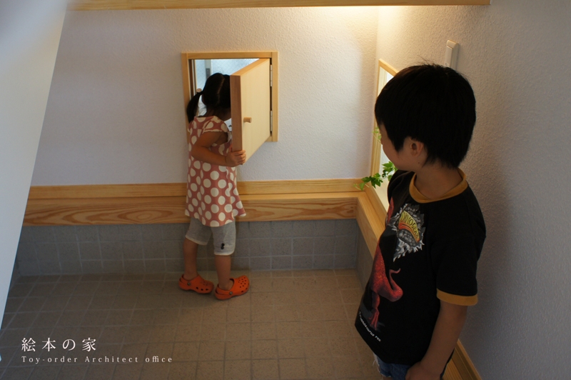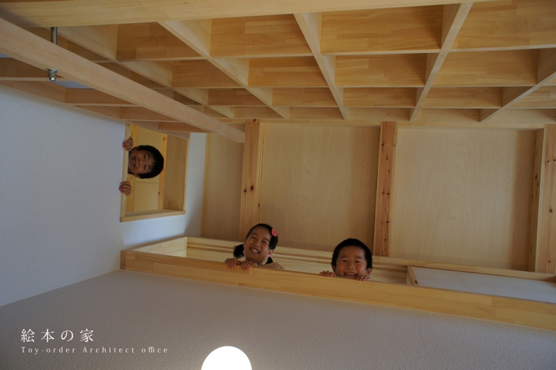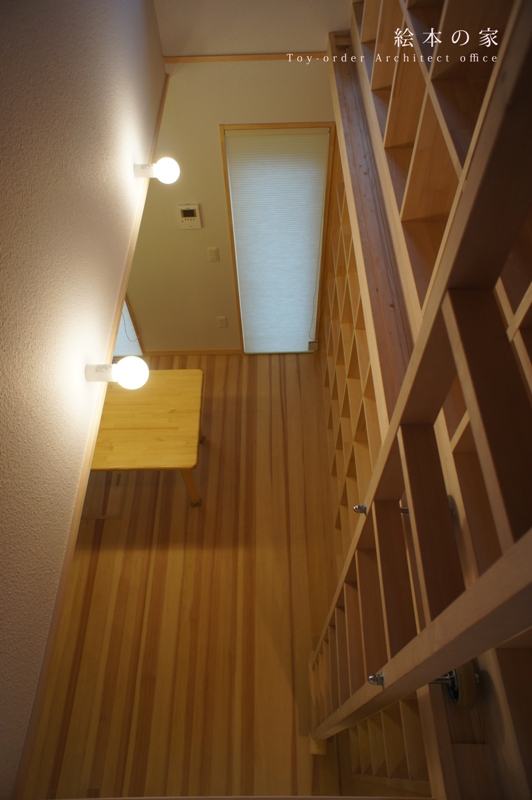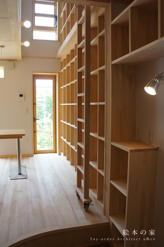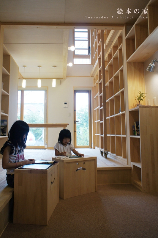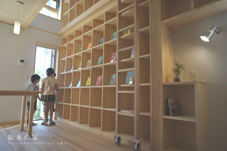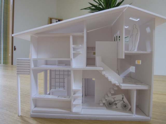 ここに、夫婦と子ども2人で住みます。絵本が2,000冊、ピアノもあります。玄関から半分上がって風呂とトイレ。もう半分上がって、書斎と寝室。風呂とトイレの上が小さな子ども部屋で、下は天井の低い納戸です。1階には巨大な本棚が書斎の高さまで続きます。もちろん、キッチンと食堂、絵本を読む小さなリビングもあります。