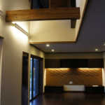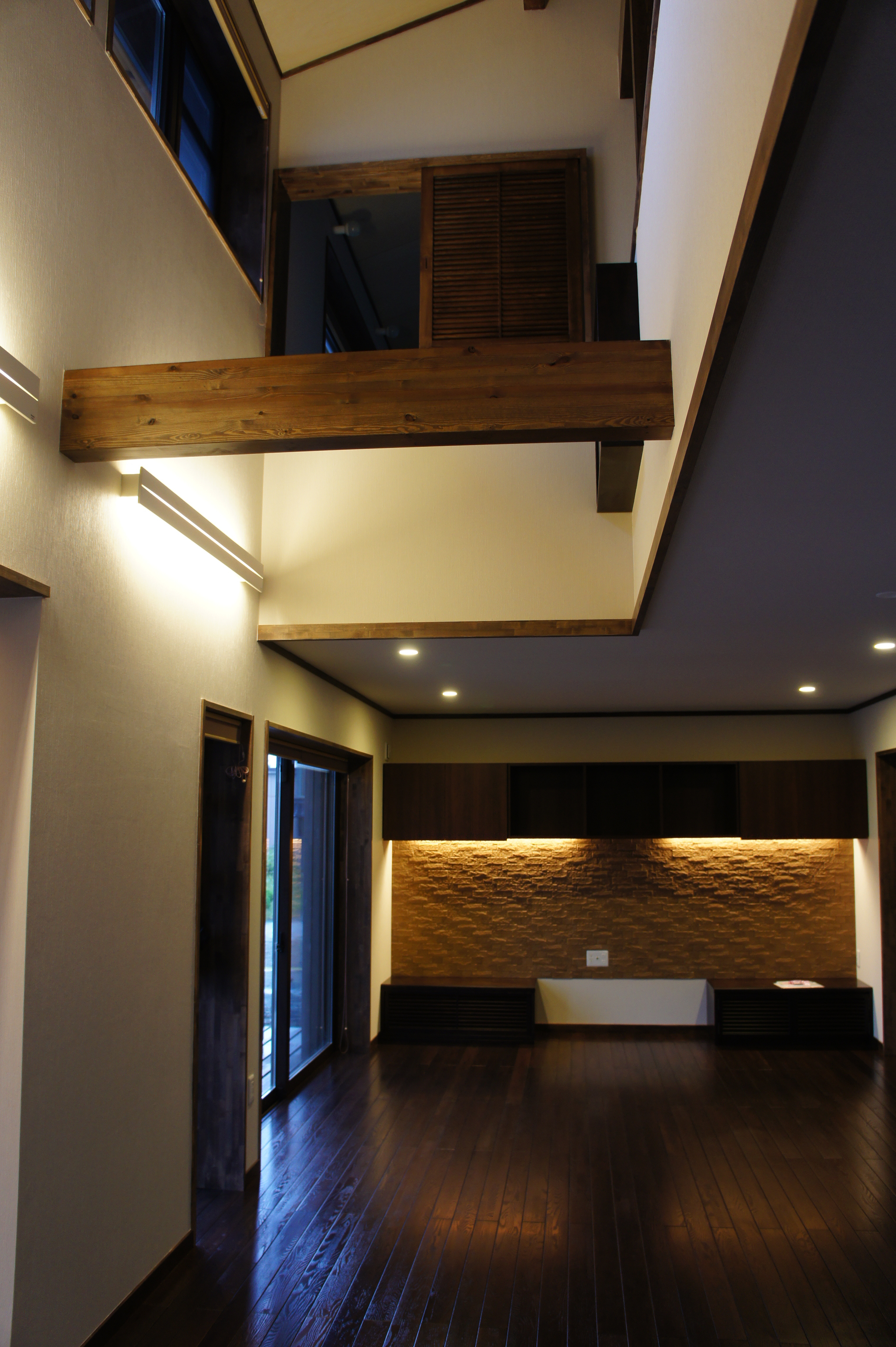 リビング中央に吹き抜けを設ける事で1階と2階の温熱環境をほぼ同じになるように。床下エアコンはテレビ台の家具と一体化してデザインし、暖房設備の存在を消しました。