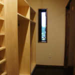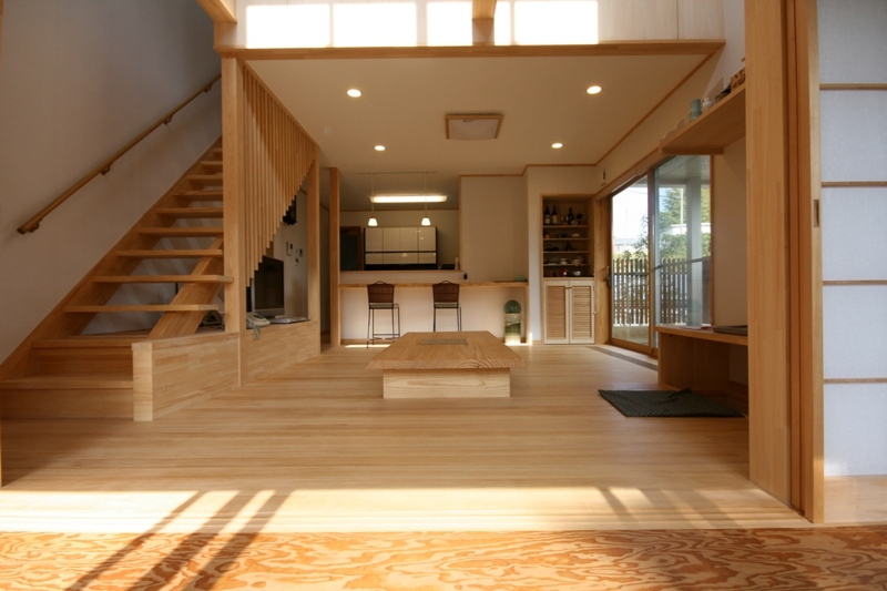 南面の窓からのパッシブエネルギーはリビングに面した土間に貯める事を想定しています。また、外付けブラインドを設け、夏の日射調整も可能としました。
